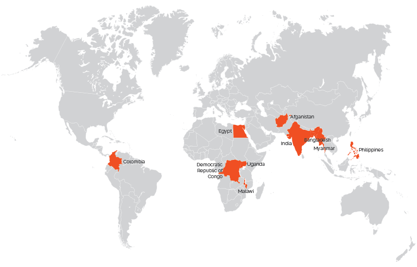 • Countries submitting program data to the global portal: Afghanistan, Bangladesh, Colombia, Democratic Republic of Congo, Egypt, India, Myanmar, Philippines, and Uganda.